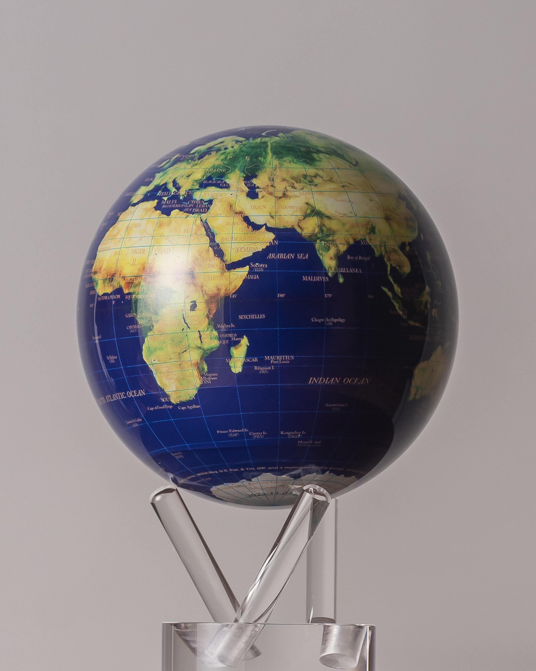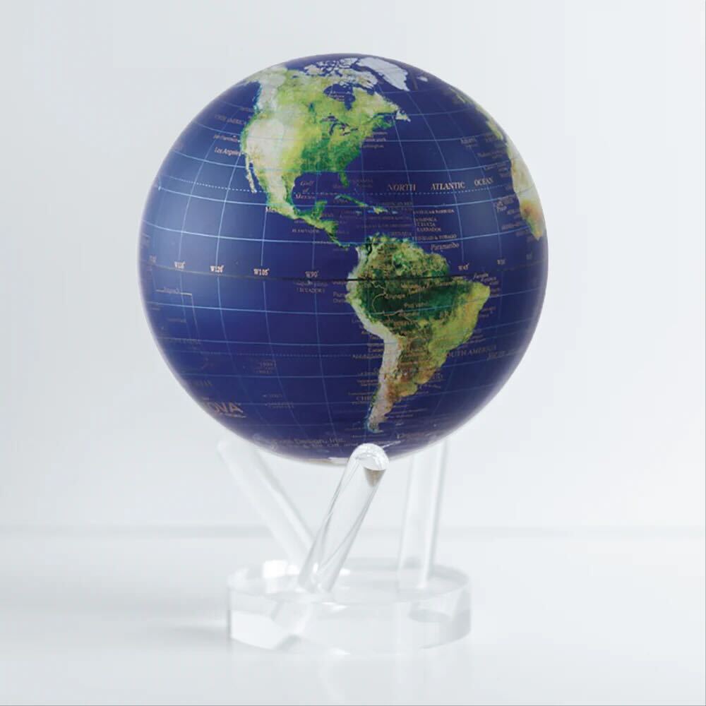 深い海のブルーに、金色の国名・地名が美しく映える、上品でクラシカルなMOVA Globe。